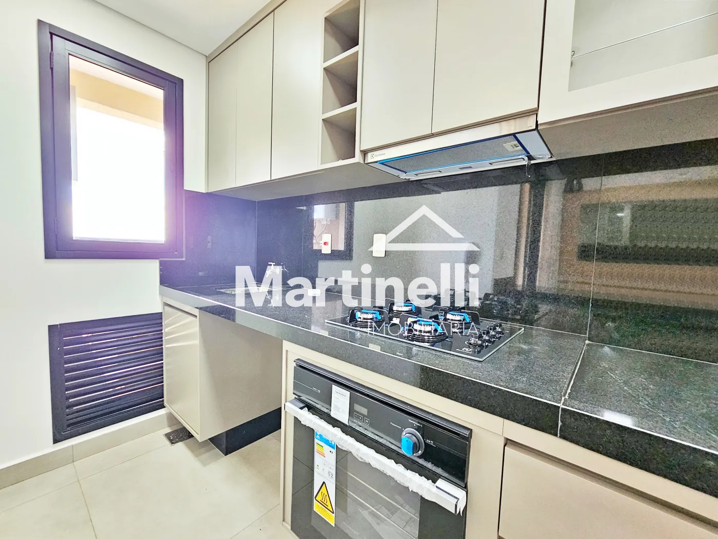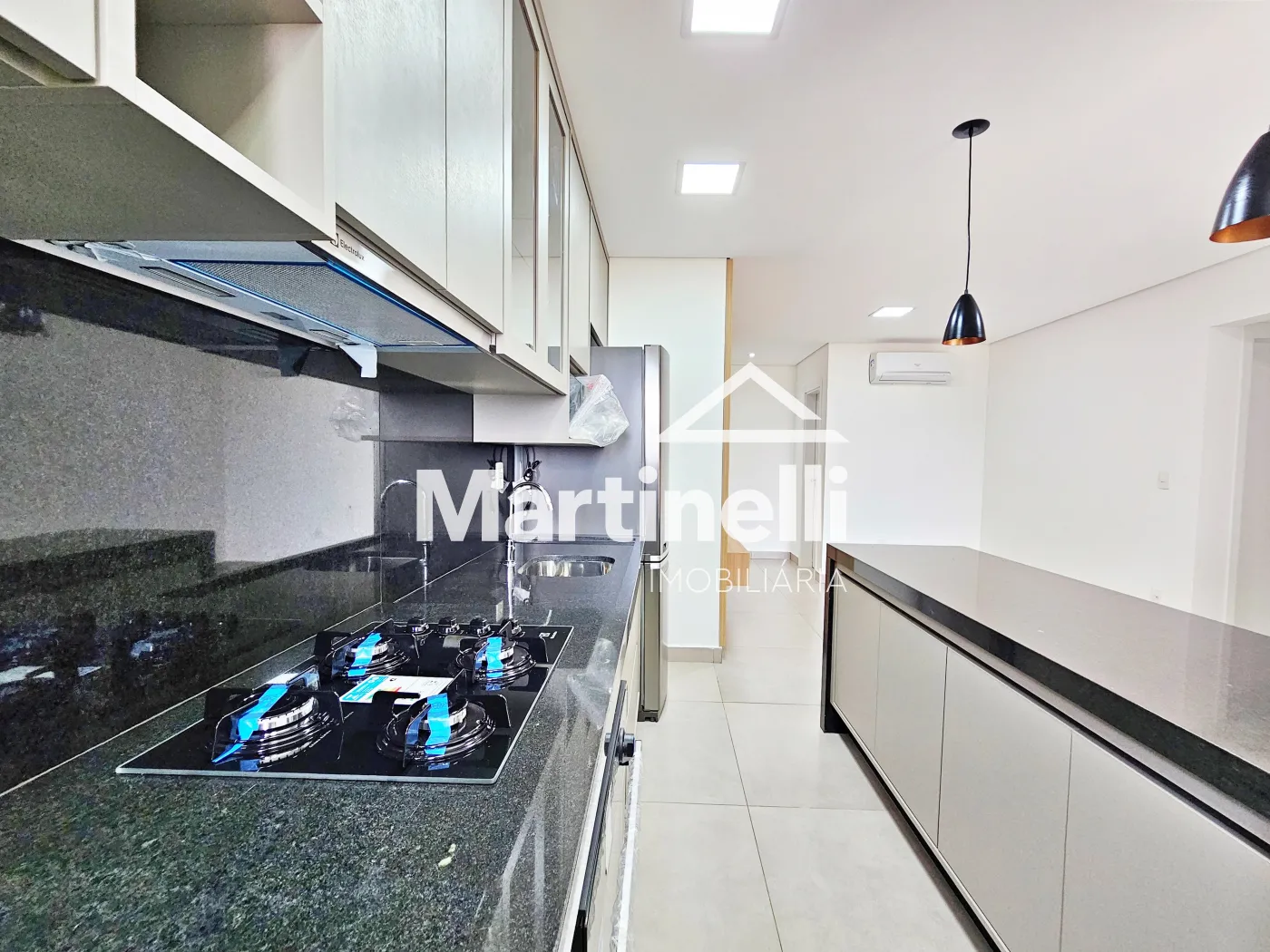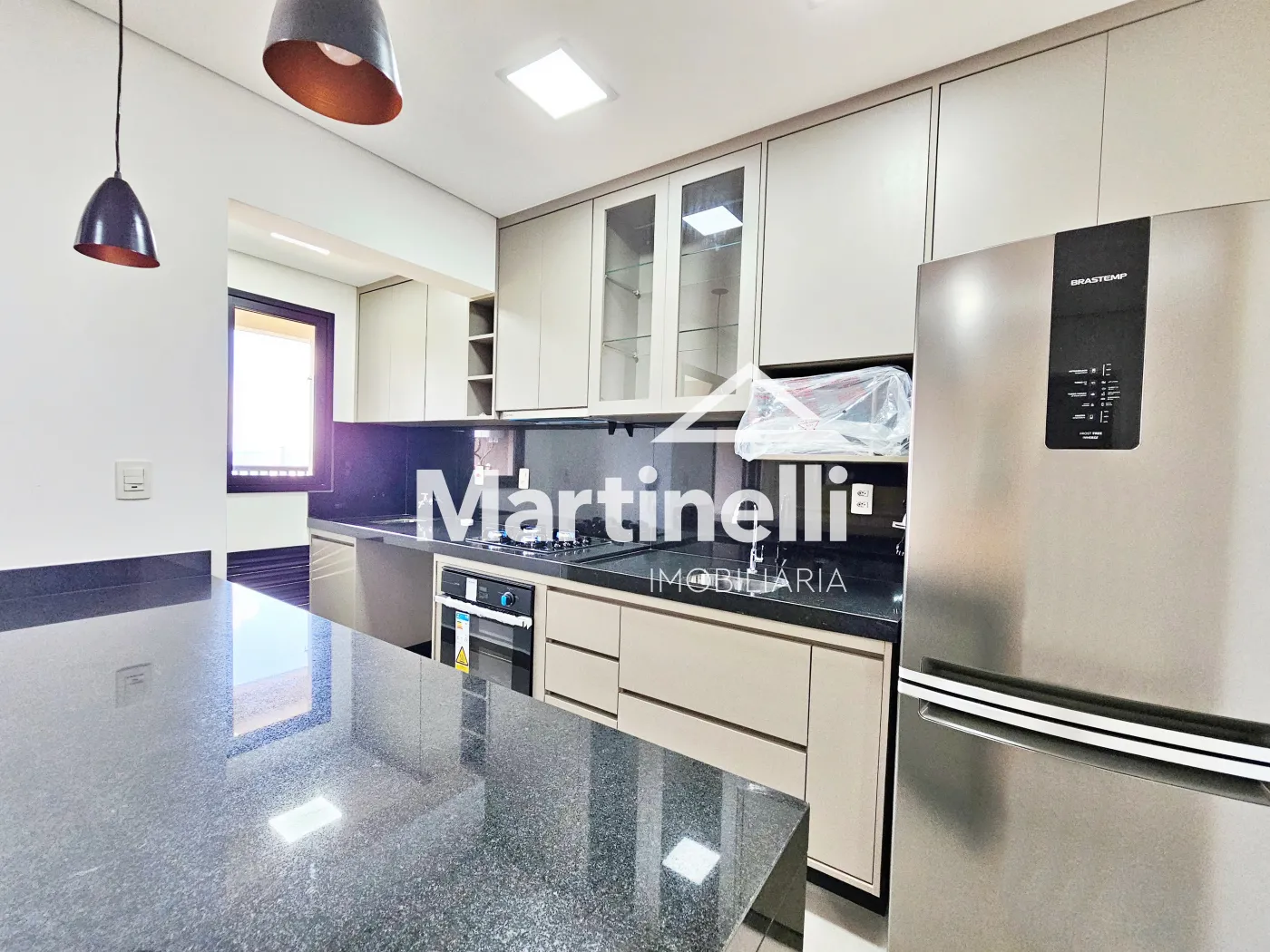 - Cozinha planejada com cooktop, forno, micro-ondas e geladeira
