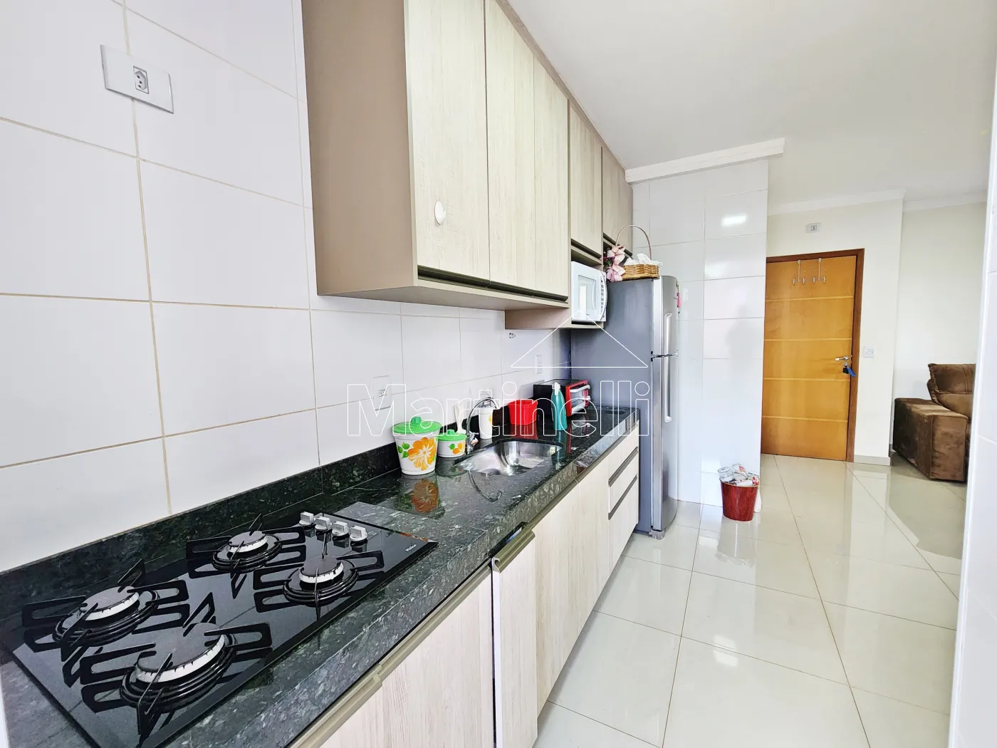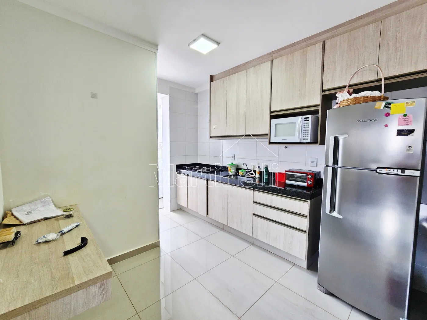 - Cozinha planejada com geladeira, micro-ondas, forno elétrico e cooktop